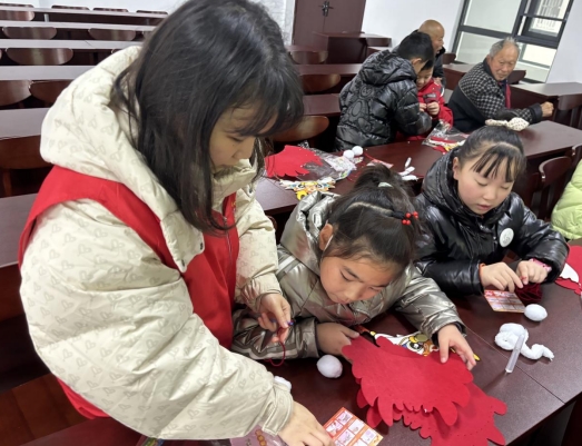 除了阅读和讨论,活动还为孩子们准备了手工制作环节。志愿者们发放了“头龙帽”制作材料包,引导孩子们亲自动手制作头龙帽。在志愿者的耐心指导下,孩子们发挥想象力,认真制作着属于自己的头龙帽。不一会儿,一个个精美的头龙帽就完成了。孩子们戴上自己制作的头龙帽,脸上洋溢着自豪和喜悦。此外,活动还特别设置了写下新年期待的环节。志愿者们邀请孩子们用纸笔写下自己的新年愿望和期待。活动最后,柏墅村为孩子们准备了龙年主题公仔盲盒抽取,让孩子们感受着迎接新年的喜悦和美好。