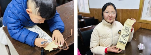 最后,孩子们在家长的帮助下,亲手制作龙年的小卷轴,将可爱的龙的图案绘制到卷轴上。在卷轴的一笔一画中,孩子们对传统文化有了更深的理解和感悟。