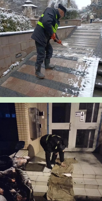 金尧花园辖区上城风景5-11栋掌上云居民交流群里居民在交流,发现时家门时单元门口的台阶很是湿滑,提醒其他业主注意安全。就在这同时,掌上云交流群里管理员也观注到了这一信息。于是,立刻回复群居民,社区和物业已经在行动。随即将工作人员正在陆续铺设楼道口与积雪干道的照片转发到群里,提醒居民还是要注意安全。就是这样,在物业的辛苦付出下,在居民的渴望下,南苑小区19栋55个单元,工作人员顶着严寒在寒风夜色中楼道单元门口的草垫铺设完毕。