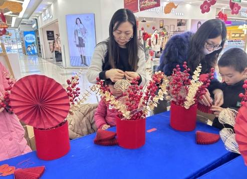 在亲子手工制作新年抱抱桶环节中,工作人员提前准备好带有新年祝福字样的抱抱桶,家长和小朋友们共同携手将冬青、金钱草和蕨叶等材料设计好造型,并添加配饰,让大家现场感受新年的美好氛围。