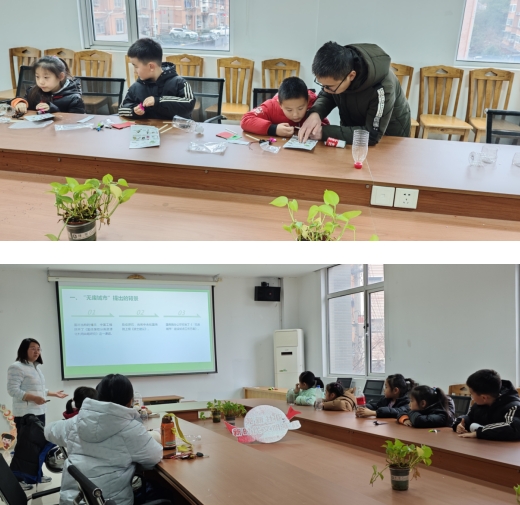活动开始,社工通过PPT向孩子们介绍了从无废城市走向无废社会的提出背景和重大意义。“无废校园”是建立在“无废城市”概念基础上,是一种先进的校园理念,通过师生自觉践行资源节约、环境友好、简约适度、绿色低碳的生态文明生活行为习惯,在校园中达成废弃物的“可见、可减、可用、可消”,最终实现整个校园废物产生量减少、资源充分利用、安全处置的目标。接下来,社工带领孩子们动手利用空的矿泉水瓶制作小吸尘器,利用纸杯制作小台灯,积极倡导“无废”理念,培养孩子们自觉投入到“无废学校”建设的宣传和实践中去。