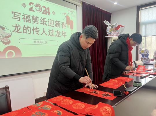无联不新春,有联春意浓。为深入推进全民阅读,同时弘扬中华优秀传统文化,积极营造喜庆、文明、和谐的春节文化氛围,近日,润康苑社区综合文化服务中心开展“写福剪纸迎新春,龙的传人过龙年”“文明润康,温暖新春”全民阅读春风行动。