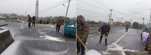 受降雪天气影响,西埠村道路出现积雪湿滑现象,给道路交通安全带来隐患。南京市江宁区淳化街道西埠村志愿者、网格员、民兵联动,对积雪结冰路段开展撒盐融冰除雪工作,将降雪天气对道路交通的影响降到最低,为人民群众的安全出行提供有力的保障。