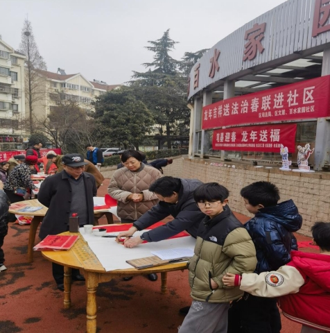 福送万家人民至上江山秀,梦圆九域天地播春气象新。为使青少年感受春联魅力,传承民俗文化,彰现新年喜庆,增强文化自信,倾心倾情为青少年和社区居民做好事办实事。2月1日上午南京市栖霞区马群街道百水家园便民服务站联合司法局在百水家园社区法治文化广场,组织开展了“墨香迎春福到家,关爱慰问进社区”文化惠民活动。活动邀请了农工党中央书画院理事、书法家薛治洲、中国书画家协会会员、书法家孟凯、江苏省书法家协会会员、书法家王翔宇、江苏省书法家协会会员、书法家宋新元、江苏省标准草书研究院理事、书法家罗正斌,现场为社区居民献墨宝,送春联。百水家园党委书记杨阳、全科社工、志愿者等参加了活动。