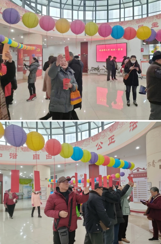 活动现场灯谜区最为热闹,灯谜内容广泛,既有通俗易懂的趣味猜题,也有较为复杂的科普谜题,内容涵盖党史知识、社会主义核心价值观、生活常识、民族团结等多个方面。大家各个跃跃欲试,谜面看似简单,想要答出,还需费一番心思,大家你一条我一条,争先恐后地竞猜抢答。为了鼓励猜中的居民,每位“猜谜达人”都会获得社区为他们精心挑选的小礼物。