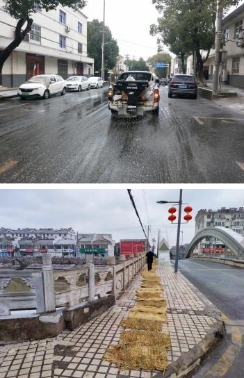 2月22日下午,湖熟多地出现雨、雪、冰粒、霰等复杂天气,温度骤降。为防止道路结冰,保障群众出行安全。街道城管办严格按照区、街关于扫雪防冻工作部署要求,积极采取各项措施。按照“先主次干道、后背街小巷”的原则,对主要道路、桥梁、陡坡、农贸市场等重点部位抛撒环保型融雪剂,防止道路结冰;及时在人行道、桥梁、坡道、公交站台等易结冰区域铺设防滑草垫,方便过往行人通行。