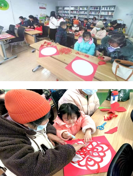 故事会前,老师先带领孩子们一起做热身活动手指谣,充分调动了孩子的积极性。之后志愿者老师绘声绘色地讲解了绘本《春福》,故事以除夕为舞台,讲述掉落人间的精灵小福气,在孤单无助的夜里走进了狐狸面馆,因为小狐狸的善良和分享,小福气发现了不一样的自己,通过自我成长创造了不可思议的幸福除夕。志愿者老师在阅读过程中积极引导家长与孩子互动,共同探讨故事情节,并通过角色扮演,让孩子深入理解人物性格,感受到福气传递的幸福和美好,明白了温柔和善良有着不可思议的力量。最后,老师带领着孩子和家长一起剪窗花,进一步加深了孩子们对中国传统文化的了解。