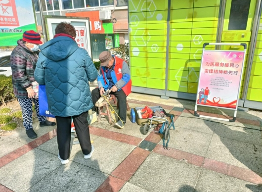 此外,活动现场还设置了磨刀区、理发区以及问题答疑区。磨刀师傅们耐心地为居民们打磨旧刀具、剪刀,让它们焕然一新。理发师们则为居民们提供了简单发型的免费义剪服务,让大家在新的一年里焕发新气象。问题答疑区的工作人员们则化身“智囊团”,耐心解答老年居民们在智能手机维修、app下载卸载、养老保险认证等方面的基础问题,帮助他们更好地适应现代生活。