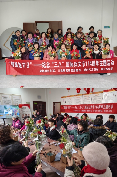 在第114个“三八”国际妇女节到来之际,果场社区妇联、掌云工作小组依托社区新时代文明实践站,联合果场社区三槐居家养老服务站在社区综合文化服务中心,组织社区“齐益果”积分制志愿者、社区居民,在专业插花老师的教学下,学习并制作了给自己的一束花,情暖她节日。
