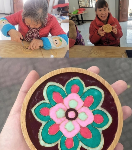 在掐丝珐琅手工制作中,志愿者老师为大家讲解了掐丝珐琅的历史渊源、发展历程和掐丝等工艺流程。妇女阿姨们跃跃欲试,在老师的指导下,每个人都小心地拿起金丝线,按照底板的轮廓勾勒出一个一个线条,掐丝、注胶、调沙、上色,在一个半小时的制作过程中,大家相互交流,互帮互助,兴致盎然,尽情享受着亲手创作的乐趣。