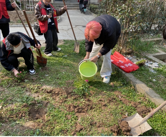 活动中,志愿者们分工协作,有的挖坑,有的扶苗,有的浇水,有的培土,忙得不亦乐乎。随着一株株承载着美好希望的树苗、花朵种下,大家用实际行动呼吁爱绿护绿植绿。