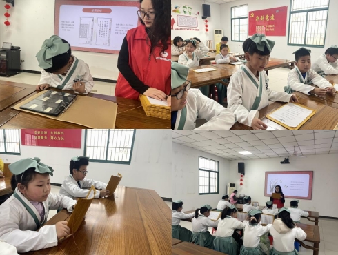 活动现场,“童”学们身着唐装,手捧竹简,目不转睛的欣赏志愿者老师精心准备的《望岳》、《无题》等邮票......“杜甫《望岳》诗采用楷体书写,书法采用唐代颜真卿作品集字,沉稳厚实,表现了诗人雄心气魄;李商隐《无题》邮票,画面设计为卷起的古版《唐诗三百首注疏》刻本《无题》页面。”这些邮票以唐诗为主题,通过邮票设计师的巧妙构思和精湛技艺,将唐诗的意境和韵味融入邮票图案之中,诗意浓厚,展现了唐诗的独特魅力和丰富内涵。同时,志愿者还为大家讲解每一张邮票背后的故事,以及古诗的韵律和意境。现场气氛热烈而温馨。
