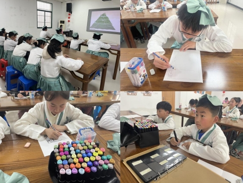 今天的互动环节首先是安排孩子们相互分享自己喜欢的唐诗,其次开展《猜诗名》、《诗词接龙》等游戏,最后让大家用绘画的形式将自己喜欢的唐诗,在画作的背景中巧妙地融入文字、面值、边框装饰等邮票特有元素。只见孩子们全情投入到创作之中......不一会儿,一张张既有美感而又富含创意的“邮票”,展现了孩子们对祖国和未来的美好期待和祝福。