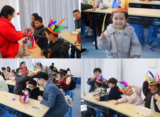 读完绘本以后,党员志愿者带领大朋友、小朋友们拓展手工作品“羽毛帽子”。小朋友们用卡纸做了帽子,然后将彩色的羽毛依次贴在帽檐边上,做出了一顶顶具有民族特色的小帽子,展现出传统的色彩美。