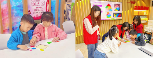 活动当天,社区志愿者首先向参与活动的小朋友们介绍了七巧板的历史和玩法,并进行了现场演示。在志愿者的指导下,孩子们纷纷拿起手中的七巧板,开始尝试拼凑各种图案,孩子们充分发挥自己的想象力和创造力,有的小朋友拼出了栩栩如生的小猫、小狗,有的则拼出了含苞待放的小花、自由飞翔的小鸟。这些作品不仅展示了孩子们的创意和才华,也让他们感受到了拼搭的乐趣和成就感。在熟悉基本的拼搭图形后,开展了“爱心拼一拼”小游戏。小朋友们发挥自己的想象力,用手中的七巧板块拼出不同的爱心,志愿者老师们也对小朋友对作品进行指导和点评。
