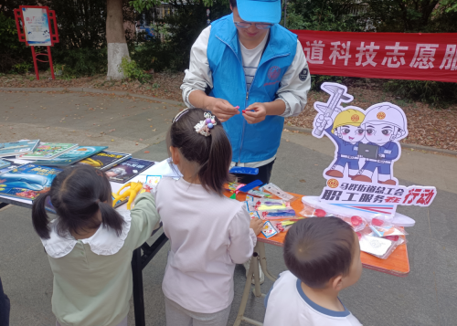 活动现场一片热闹景象。在科普书籍展区,一本本内容丰富、图文并茂的科普书籍整齐排列,瞬间吸引了众多亲子的目光,他们纷纷驻足停留,有的孩子则拉着家长迫不及待地翻阅起来,沉浸在科学知识的海洋里。“咱们社区二楼的‘馨享书屋’里藏着各种各样的好书,大家有空的时候,不妨多去书屋坐坐,或者前往进行借阅,把心仪的书籍带回家慢慢品读。”一边,志愿者面带笑容,耐心细致地向大家介绍了社区“馨享书屋”藏书情况,鼓励大家常去书屋转转,共享阅读之乐。在科普有奖答题区,社区精心准备了简单又贴合生活的多领域科普题目,孩子们积极思考、踊跃参与,凭借自己的知识储备和生活观察赢得专属于自己的奖品;在趣味科技手工区,桌上摆放着制作不倒翁和气球直升机的材料。孩子们根据自己喜好选取了心仪的材料,随后在志愿者的指导或家长的帮助下,有条不紊地进行了组装,在操作实践中体验了动手的乐趣,并学习到科学原理。